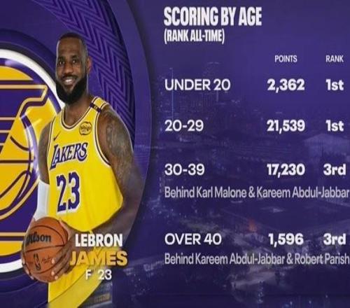 詹姆斯生涯得分年龄分布:2029岁砍21539分历史第一
