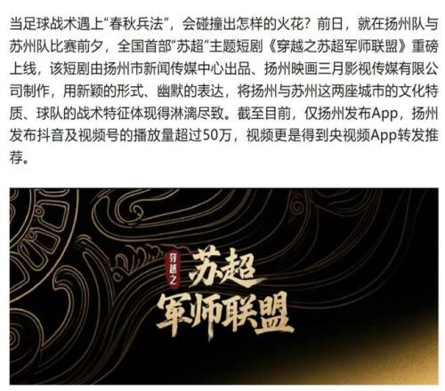全国第一部“苏超”短剧《穿越之苏超军师联盟》,上线不到一周播放量破50万;83集的《苏超球王》,上线没多久就砍下近3000万播放热度。