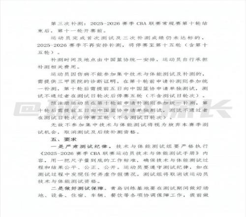 北京时间今日,据国内篮球媒体人“球圈赵探长”社媒消息,中国篮协已向CBA各俱乐部下发新赛季体测通知,体测新规中参加体测的综合排名后10%成绩的球员算未达标。